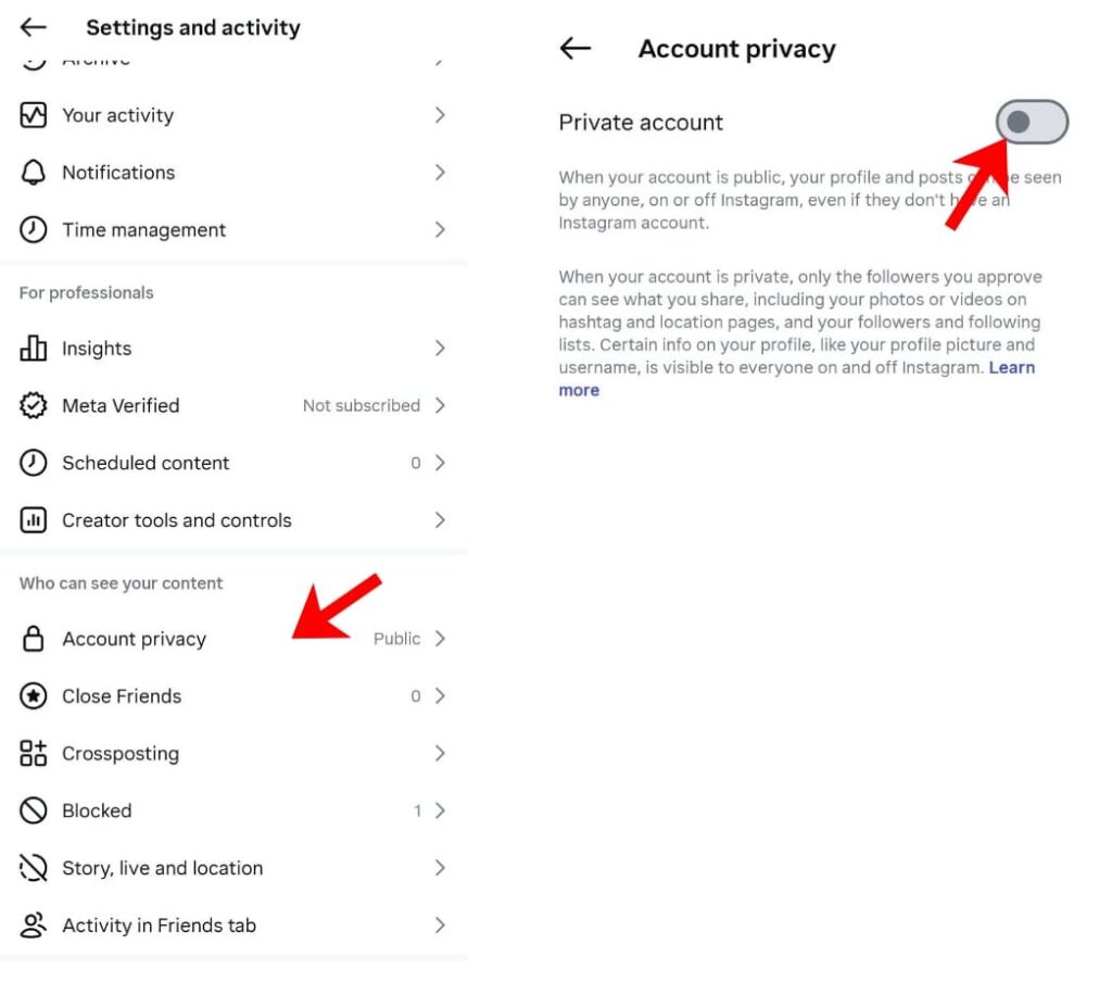 - “Private Account” का ऑप्शन दिखाई देगा, जो पहले Disable होगा।