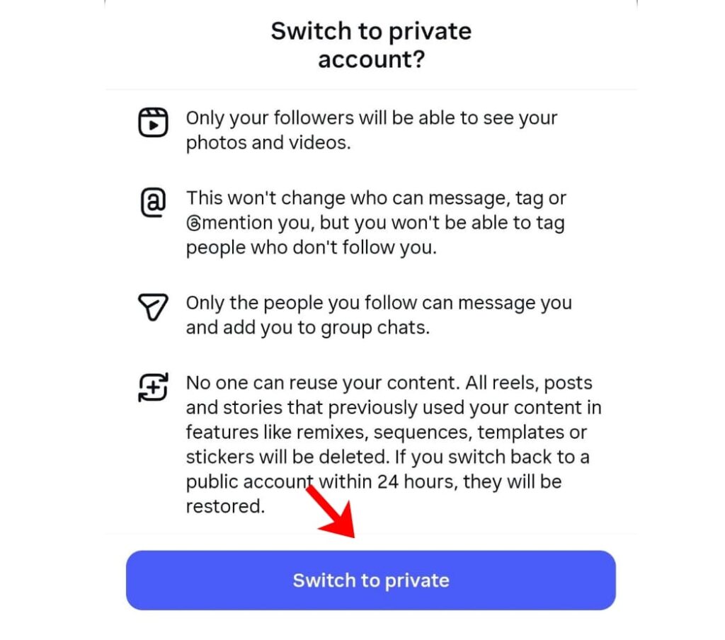 बस, इतना करते ही आपका अकाउंट प्राइवेट हो जाएगा। अब आपकी पोस्ट, रील और स्टोरी केवल वही लोग देख पाएंगे जिन्हें आप फॉलो रिक्वेस्ट स्वीकार करेंगे।