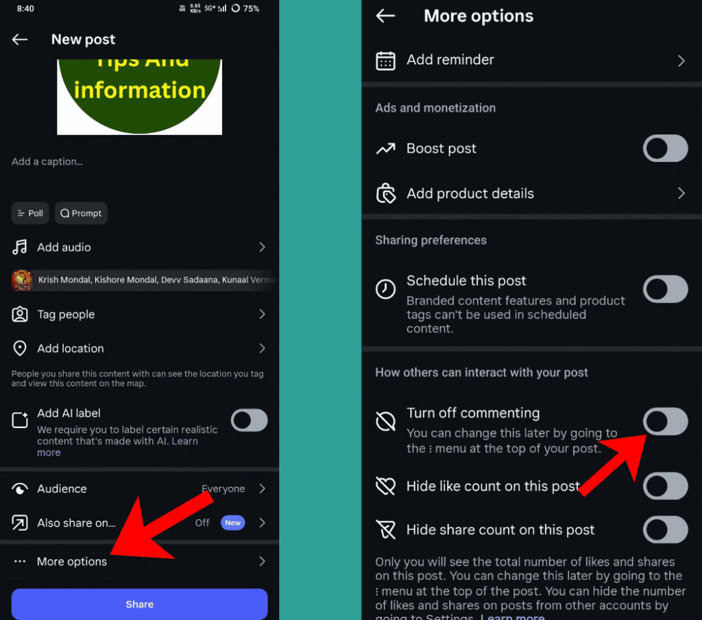 - अब आपको पोस्ट शेयर करने से पहले नीचे की तरफ More options दिखाई देगा, उस पर क्लिक करें।