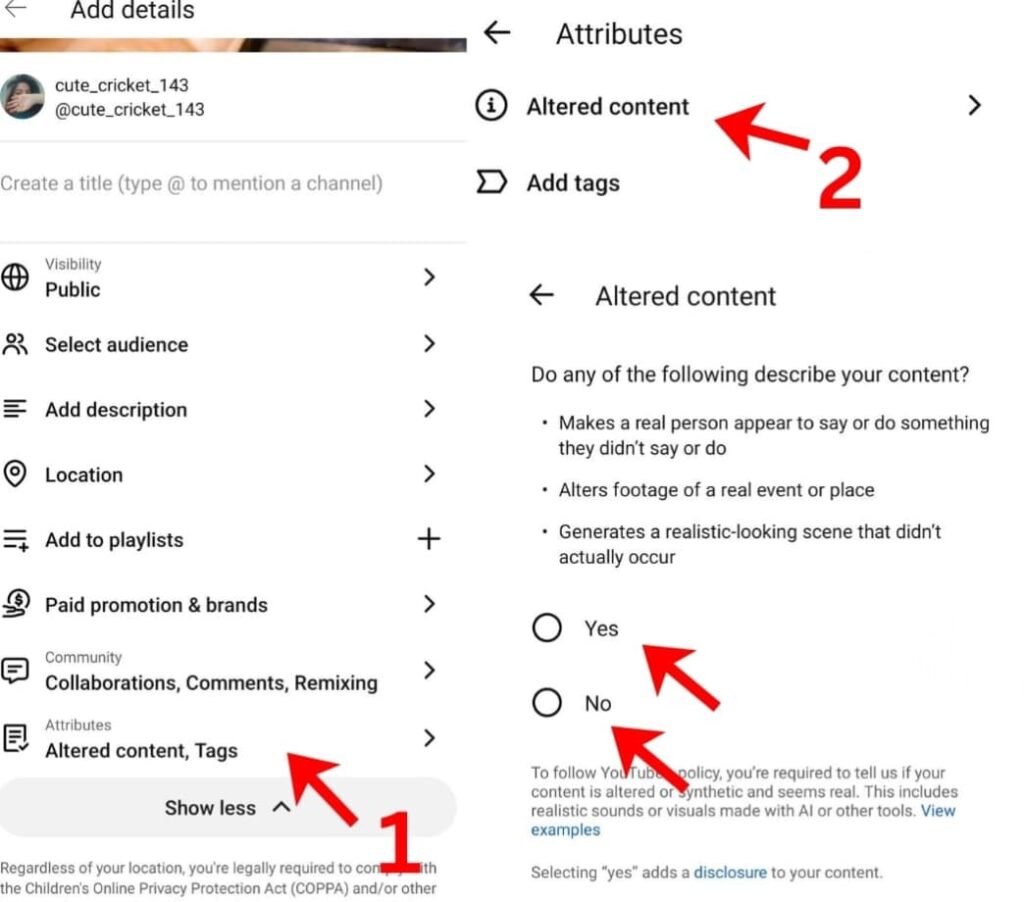 अगर आप YouTube Shorts बना रहे हैं और उसमें AI का इस्तेमाल कर रहे हैं, तो आमतौर पर प्लेटफॉर्म खुद इसका संकेत दे देता है। लेकिन लंबी वीडियो अपलोड करते समय Creator को खुद यह फ़ैसला लेना होता है कि Altered Content है या नहीं।